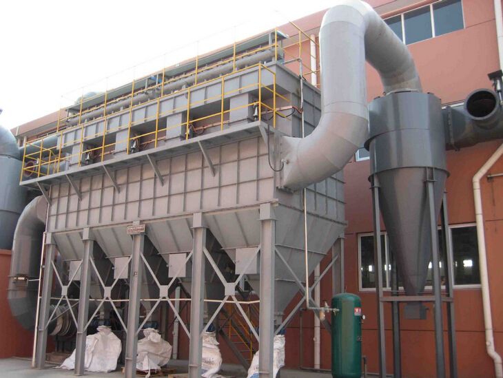 含塵氣體由除塵器進風口進入中,下箱體,通過濾袋進入上箱體的過程中由于濾袋的各種效應作用。將粉塵氣體分離開,粉塵被吸咐在濾袋上,而氣體穿過濾袋由文氏管進入上箱體,從出風口排出。含塵氣體通過濾袋凈化的過程中,隨著時間增加,而積在濾袋上的粉塵越來越多,因而使濾袋的阻力逐漸增加,通過濾袋子的氣體量逐漸減少,為了使除塵器能正常工作所以要把阻力控制在限定范圍內(一般為120-150毫米水柱)。這樣當阻力升到限定范圍的時候,由控制儀就要發出指令按順序觸發各控制閥,開啟脈沖閥。氣包內的壓縮空氣由噴吹管各孔經文氏管噴射到各對應的濾袋內,濾袋在氣流瞬間反向作用下急劇膨脹,使積在濾袋表面的粉塵脫落,濾袋得再生。被清掉的粉塵落入灰斗經排灰系統排出機體,由于積在濾袋上的粉塵定期清除,被凈化的氣體正常通過,保證除塵器正常工作。